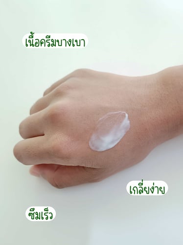 เนื้อสัมผัส: เป็นเนื้อครีมบางเบา ไม่ทิ้งความเหนียวเหนอะหนะ เกลี่ยง่าย ซึมเข้าสู่ผิวเร็ว
