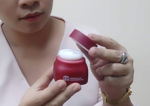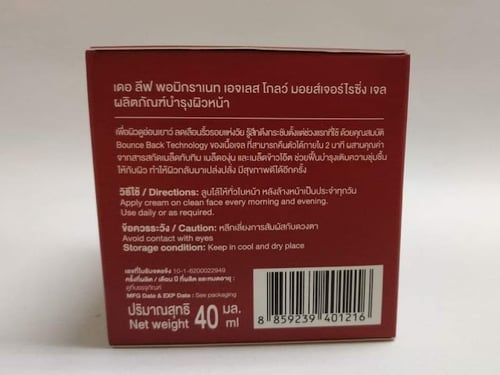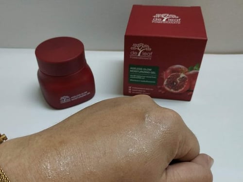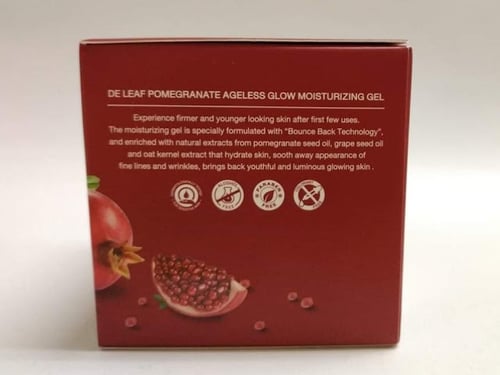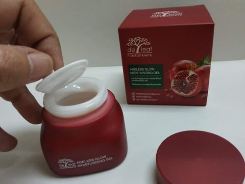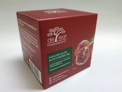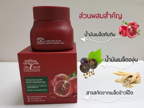 เดอ ลีฟ พอมิกราเนท เอจเลสโกลว์ มอยส์เจอร์ไรซิ่ง เจล ขอเรียกสั้น ๆ ว่า "เจลบำรุงผิวหน้าทับทิม" เพราะมีส่วนผสมหลักเป็นทับทิม และส่วนผสมอื่นที่สำคัญ ได้แก่
