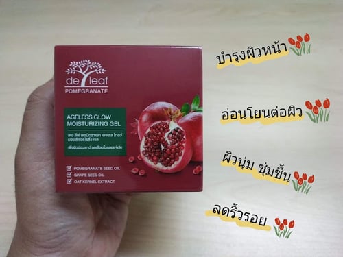เรามาดูผลิตภัณฑ์กันใกล้ ๆ ดีกว่า กล่องสีแดง แล้วด้านหน้ากล่องมีรูปทับทิมสีแดง มีแถบเขียวบอกชื่อผลิตภัณฑ์ ทั้งภาษาอังกฤษ และภาษาไทย ภายใต้แบรนด์ De Leaf