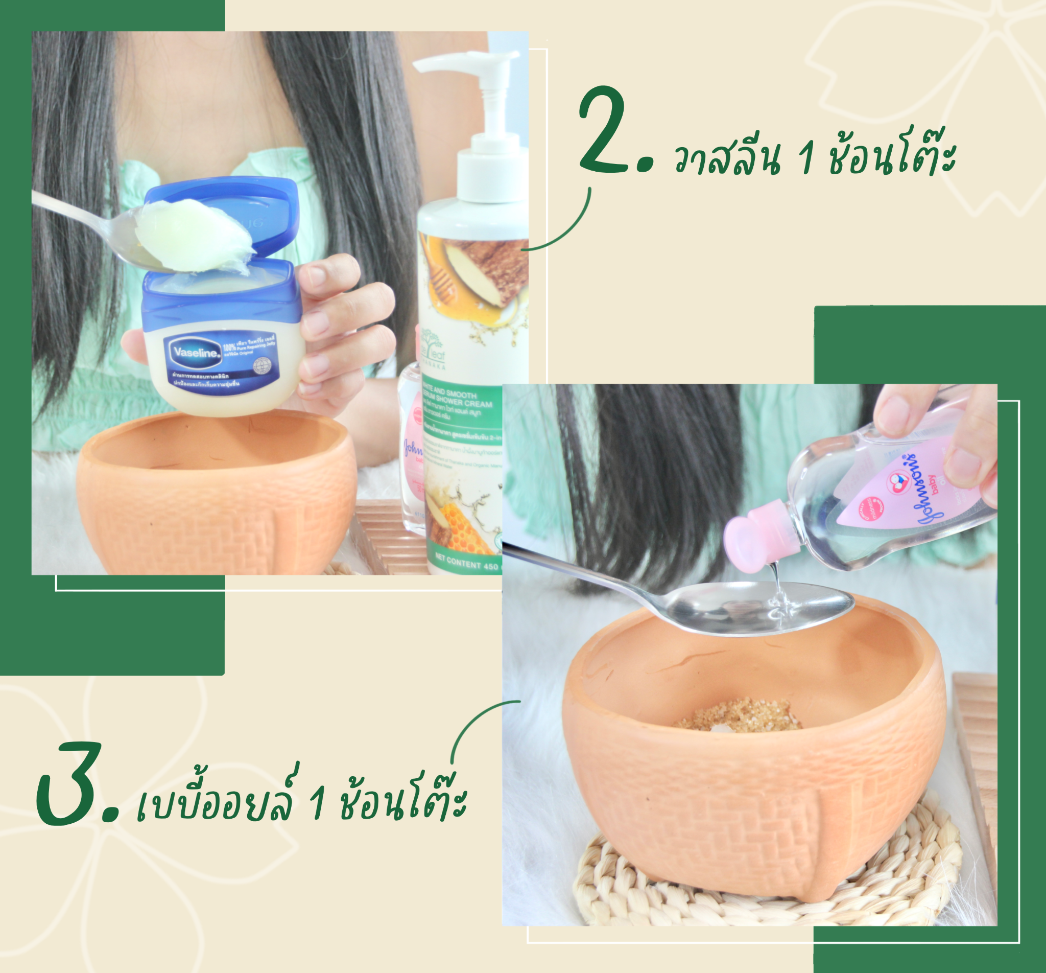 3. ใส่เบบี้ออยล์ 1 ช้อนโต๊ะ