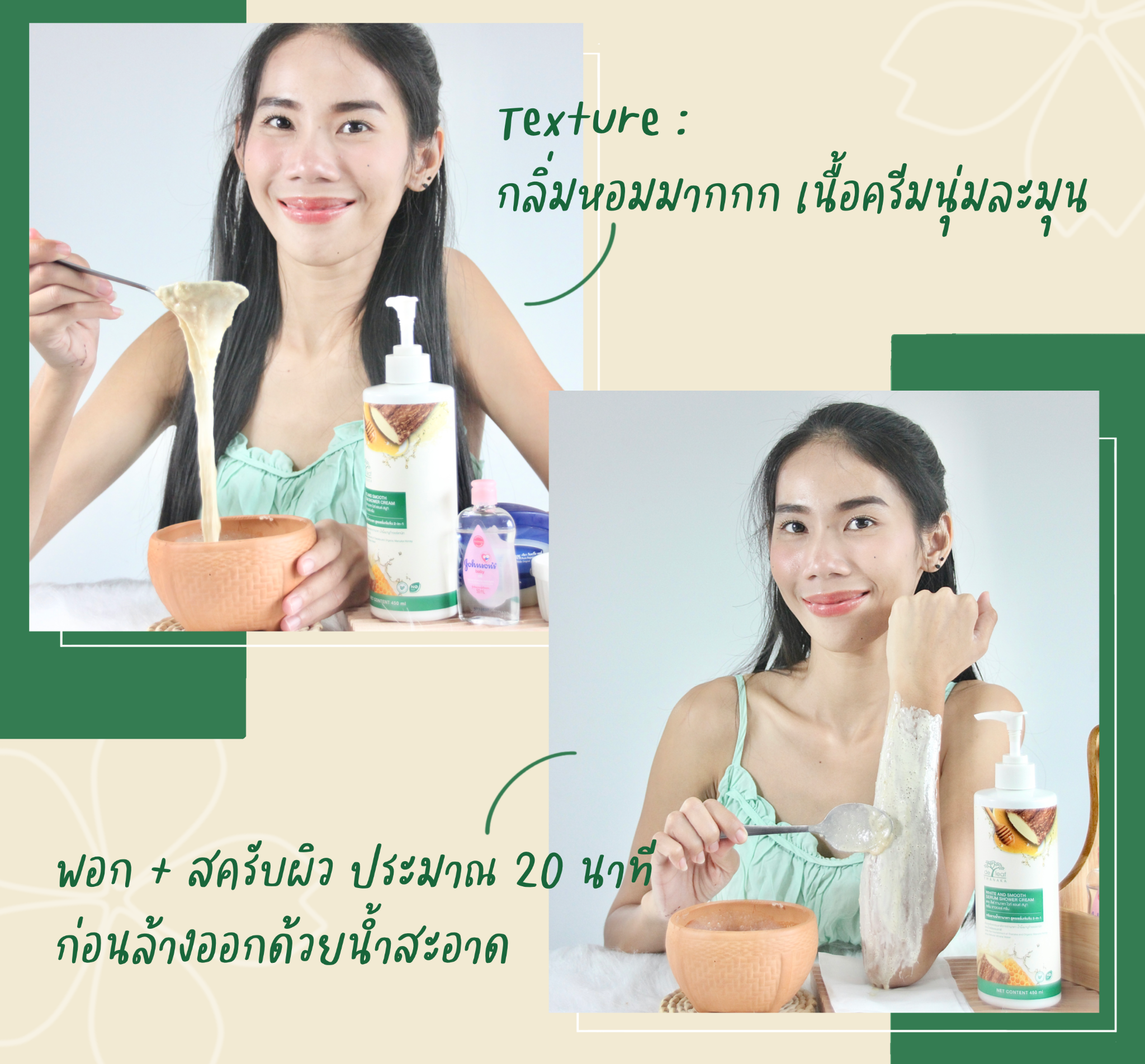 Texture : เนื้อครีมยืดๆ นุ่ม ละมุน กลิ่นหอมมาก โอพอกผิวทิ้งไว้ประมาณ 20 นาทีค่ะ และสครับผิวให้ทั่วแขน ก่อนล้างออกด้วยน้ำสะอาดค่ะ