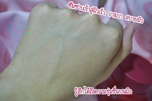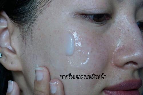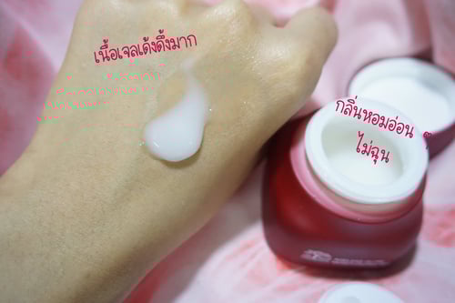 เนื้อครีมเจล สีขาวเด้งดึ้ง ไม่ไหลเป็นน้ำ มีกลิ่นหอมอ่อน สัมผัสบางเบาสบายผิว